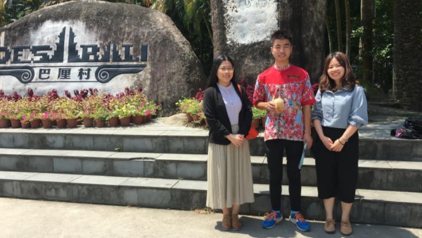 印尼语专业教师与在巴厘村实习的印尼语专业学生郑瑞明(中)合影