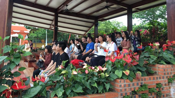 柬埔寨语梁小凤同学说:“巴厘村的建筑风格十分有特色,环境优美,有各种花草树木。金椰特别好喝,特别甜。印尼姑娘和大叔的舞蹈跳的真好。巴厘村是兴隆南洋归侨文化的一个缩影,独特的环境让我感受到了不一样的民族风俗,不一样的异域文化。”