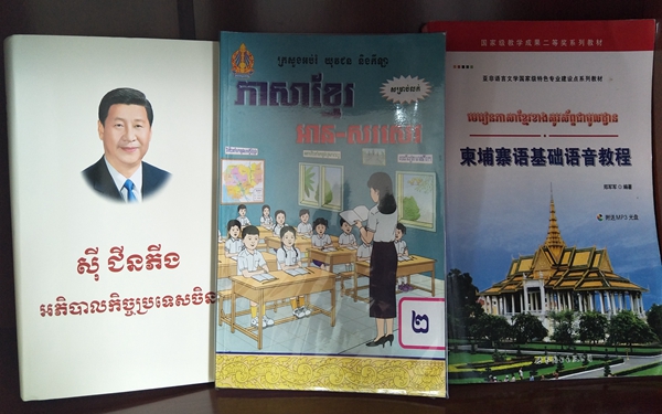 10月17日,王虎老师又向东语系赠送了自己参与翻译的《习近平谈治国理政》的柬埔寨语版译著及参与研究和翻译的《诺罗敦.西哈努克时代的柬中关系》的柬中语对照版书籍。为促进柬中文化交流做出了贡献。