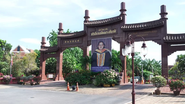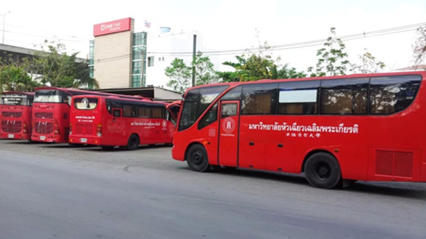 在曼谷时候,我还去参观了华侨崇圣大学。一进校门就看到红色引人注目的校车,右手有校园自行车和缆车,方便学生的出行。校园里的绿化很好,到处都是花草树木,凉亭顶部都被绿树遮围着。每个不同的系部都有该系部的特色和文化,楼道和教室外都贴着摆着很多学生自己制作的手工艺品。因为是暑假期间,校道上只有零星的几个长裙校服学生和职工人员,但还是可以感受到浓厚的学习气氛.