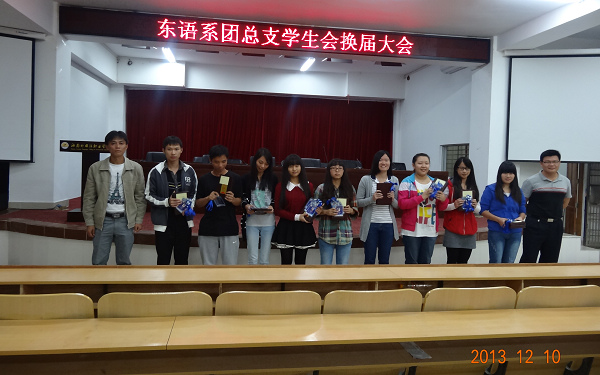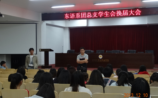 2013年12月10日晚10:00于我院多功能报告厅举行了东语系团总支学生会第六届干部换届大会,党总支张伟书记和团总支吴深书记均出席了本次会议。