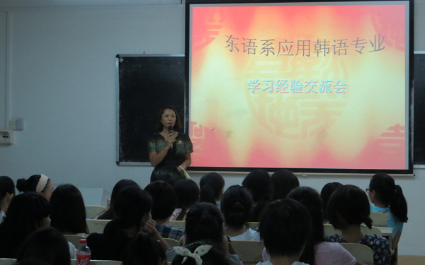 夜幕降临,多媒体8室渐渐坐满了我院韩语专业的学生,大家都为本学期的韩语专业学习经验交流会而来。晚上8点,会议正式开始,首先由许副主任介绍了整个会议议程,其中特别介绍了本学年的教学安排与韩国公派留学部分,随后便由11、12应韩班的4位优秀代表进行韩语学习经验交流,她们都把自己平时的学习方法总结出来并制作成PPT供新老生们作参考,也为韩语专业的其他学生提供较好的方法与经验。当然,更有刚从韩国留学归来的郭海燕老师和11应韩班的倪玉英同学与大家分享她们有趣的留学生活,让韩语专业的学生们更能切身体会到学习韩语的乐趣,增加学习的动力。整个学习交流会持续了2个小时左右,同学们都认真听讲并做好笔记,相信通过本期的学习经验交流会,会让更多的同学获益。