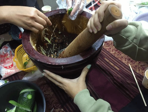 制作舂木瓜和舂黄瓜的过程,无疑是一场视觉与味觉的双重盛宴。王老师首先详细介绍了所需食材:新鲜的木瓜和黄瓜、香辣的辣椒、酸爽的小金桔、还有那必不可少的蒜瓣和蟹酱。接着,她亲自示范,将准备好的木瓜丝,放入特制的石臼中。而舂黄瓜同理,只是将木瓜丝换成了黄瓜丝。随着王阿金老师有力的舂捣,石臼中发出阵阵清脆的声响,仿佛是在演奏一首欢快的老挝民谣。同学们围在一旁,目不转睛地看着,生怕错过任何一个细节。