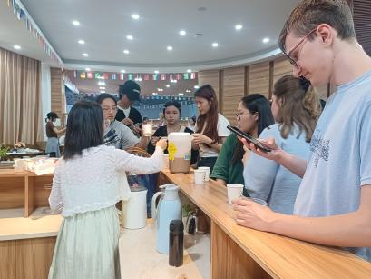 活动进行到尾声,阿里夫老师邀请同学们品尝印尼小吃,有香脆可口的炸豆腐、美味诱人的炸花生饼以及浓郁醇厚的咖啡。同学们一边品尝着美食,一边回味着刚刚的学习和制作过程,脸上洋溢着满足和快乐的笑容。
