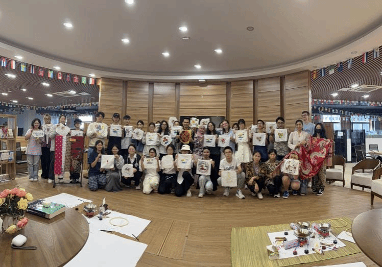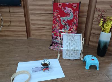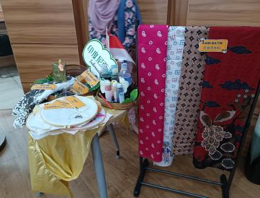 活动现场布置得美轮美奂,每一处细节都彰显着用心。阿里夫老师与他的妻子,还有翻译老师和学生团队,早早地便来到了现场,做足了准备。阿里夫老师身着以白、棕、黑三色为主的印度尼西亚传统巴迪克服饰,三种色彩相互交织、搭配得恰到好处。他妻子的巴迪克服饰则以粉色为主色调,还染着精美的花朵图案。现场展示了各种款式的巴迪克布料,有的色彩斑斓,有的素雅清新,每一块都独具特色。同时,还展示了用来制作巴迪克的染料与工具,这些工具看似简单,却蕴含着印尼人民千百年来的智慧与技艺。其中,一块红底巴迪克布料格外引人注目,上面画染着栩栩如生的龙,那龙仿佛随时都会腾空而起,让人不禁感叹印尼传统工艺的精湛。