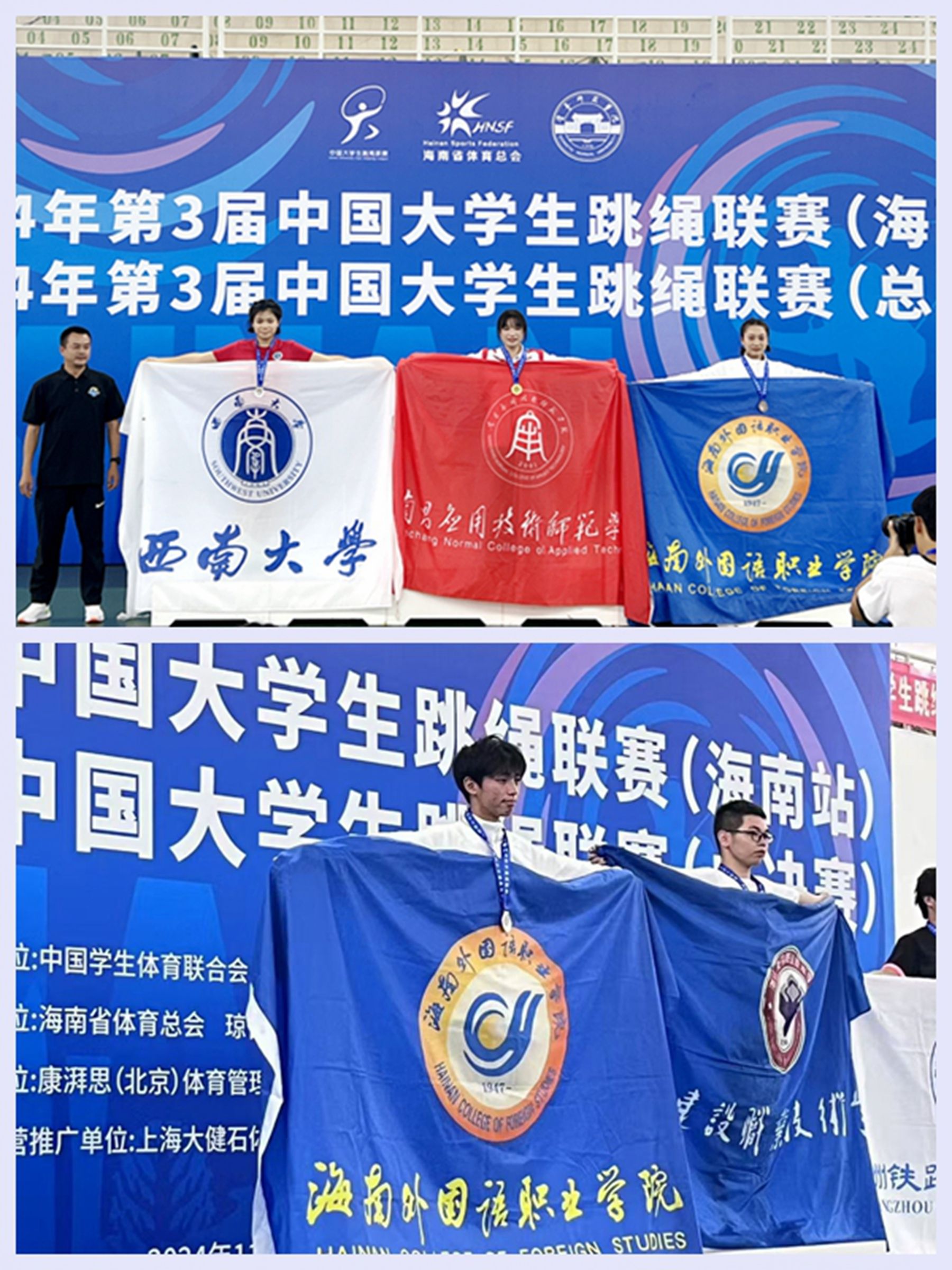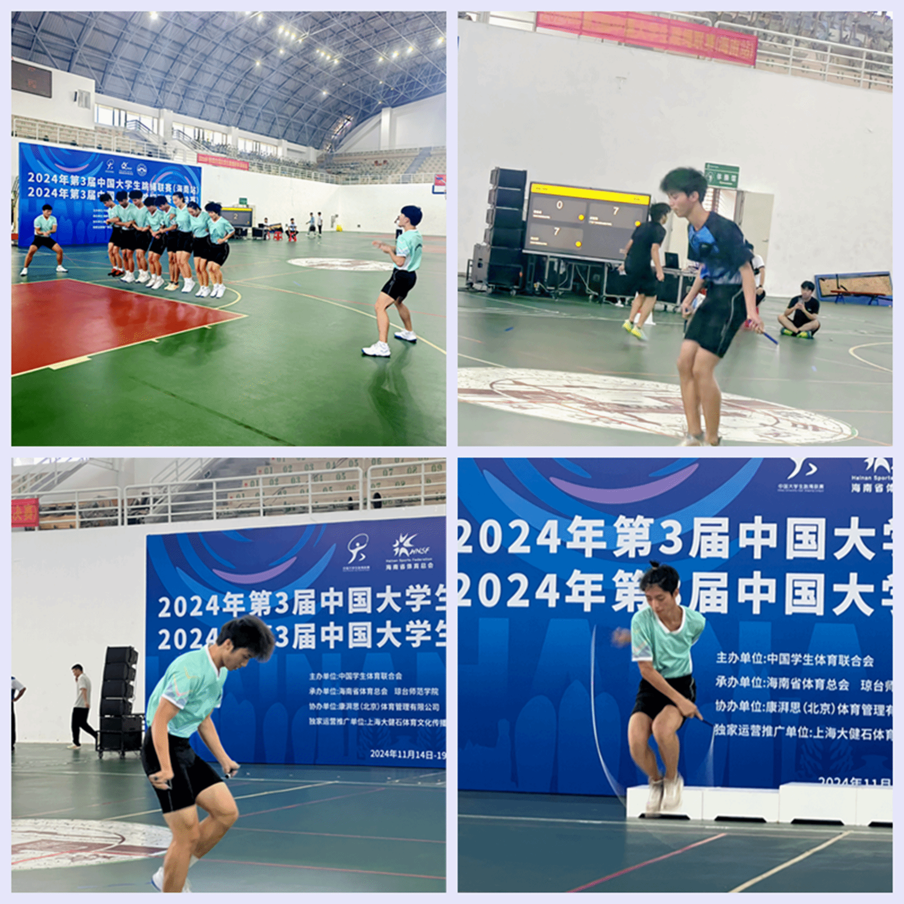 11月14日至18日,由中国学生体育联合会主办的2024年第3届中国大学生跳绳联赛在海口举办,来自全国多所知名高校,包括西南大学、上海财经大学、广州体育学院等,齐聚一堂,共同角逐荣誉。比赛分甲组(普通组)、乙组(高职高专组)及丙组(高水平组)三个组别,各组别设有计数赛、花样赛、规定赛三个大项20个小项。开云官网跳绳队分别参加乙组和丙组的比赛,经过四天激烈的角逐,最终取得6金7银3铜的优异成绩,其中在首次参加的丙组跳绳比赛中获得1金2银2铜的好成绩,实现了新突破。同时,徐晓娟和李广两位老师被评为比赛优秀教练员。
