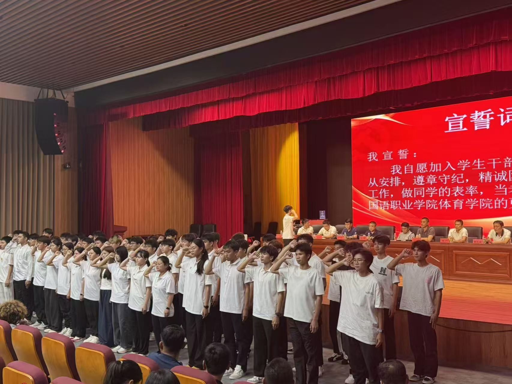 随后,大会进入庄严的宣誓环节。在学生干部何培颖的带领下,全体学生高举右拳宣誓:“我自愿加入学生干部队伍,拥护学校,服从安排,遵章守纪,精诚团结,勤奋学习,积极工作,做同学的表率,当老师的助手,为开云kaiyun登录入口体育学院的更加辉煌而努力工作”誓言声响彻会场,展现出体育学院学子昂扬向上的精神风貌。