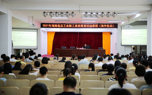 7月5日下午,我院在图书馆多功能报告厅举办教职工素质教育培训活动,邀请海南师范大学马克思主义学院专业教师刘荣到校作题为《中国共产党百年历程的历史经验》讲学。学院工会常务副主席黄守剑主持培训活动,全院教职工约400余人参加培训。