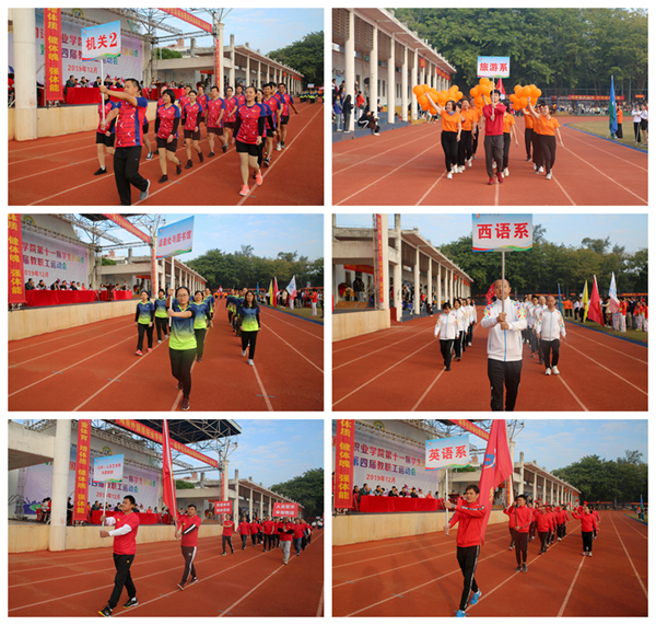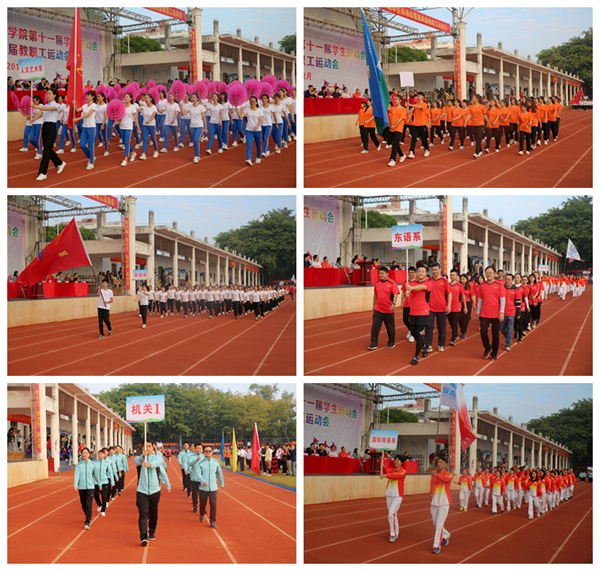 在国旗护卫队、校旗护卫队和彩旗方队的引导下,7个学生代表队,9个教职工方队,依次入场,接受检阅。一个又一个整齐的队形,大踏步向主席台走来。他们个个衣着鲜艳,面带笑容,昂首阔步,他们朝气蓬勃,带着青春的活力,迈着整齐如一的步伐,喊着响亮的口号,充分展现了海外院师生积极昂扬、拼搏不息的体育精神。