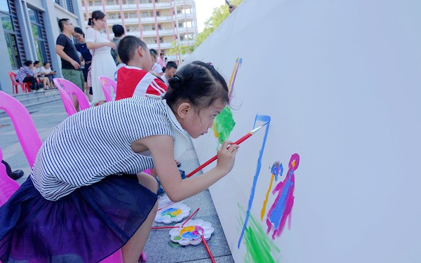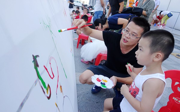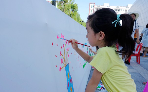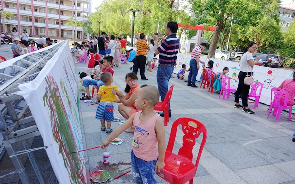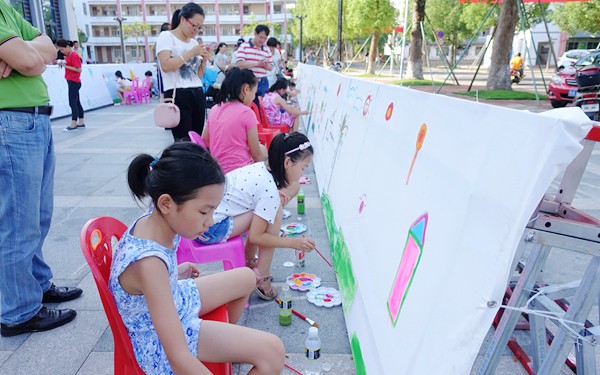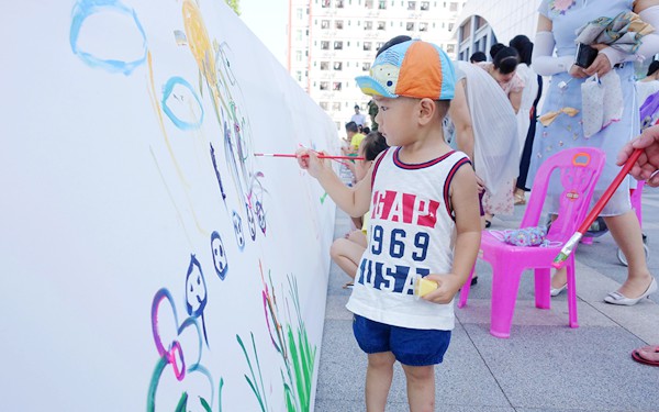 活动中以“百米”画卷的形式,各个不同年龄阶段的孩子们和家长们一同拿起画笔,在画卷上描绘出各式各样、活泼可爱的图画:比如蓝天白云、飞机坦克、各式各样的小花以及说不出名字的画作。这其中的作者既有自己独立完成画作的“大师”;也有在家长的协助下完成的“小画家”;还有更多的是“抽象派”小画家。