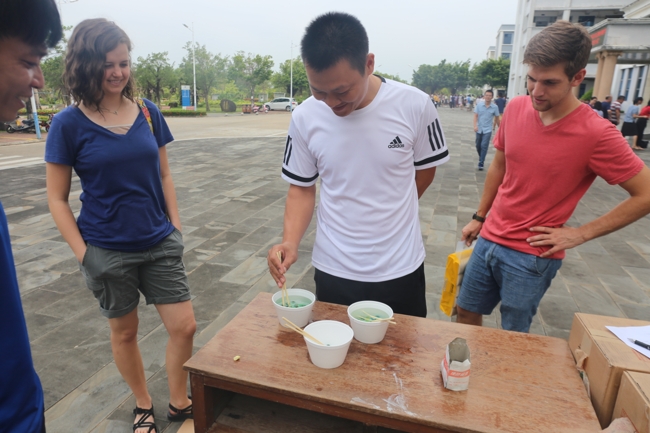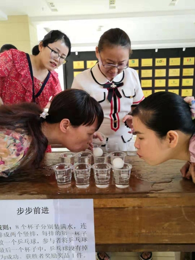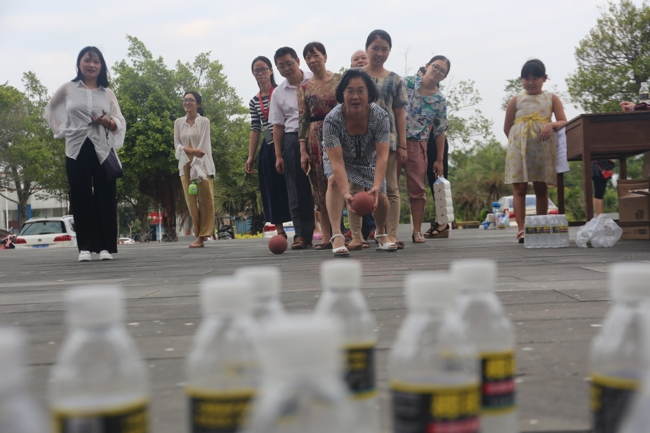 活动中游园游戏精彩纷呈,处处充满了欢声笑语。一箭穿心、青蛙跳水、掌上明珠、海底捞月、百发百中、瞎子穿拖鞋、玩转保龄球、步步前进……每一个游戏区域前都排着长长的队伍,整齐、有序,有教职工、外聘教授、外籍教师,他们神情专注、屏息凝神,互相鼓励、互相助威,展现了自我的风采。