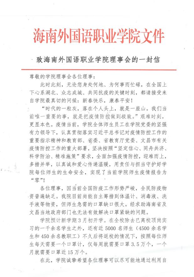 而与此同时,香港海南同乡会、泰国海南会馆的侨领等也纷纷给我院来电,愿意向我院捐助防疫物资或帮助我院在海外代购防疫物资。就在2月21号,韩电先生捐赠的第一批5000个口罩已抵达海南省红十字会,我院第一时间派人从省红十字会领取并及时发放到了在校师生手中,让师生们深深感受到了学院理事会成员的情谊。