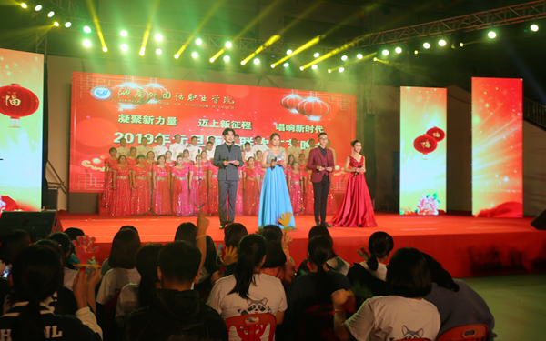 灯光逐渐凝聚,音乐缓慢响起,晚会在舞蹈《欢聚一堂》中拉开序幕。随后李渝凤院长代表学院上台致辞,向全校师生致新年贺词。她回顾了我院2018年来学院师生所取得的成绩和进步,给大家送上了新的一年的祝福与亲切的问候。李渝凤院长指出,2018年是国家、海南及学院发展的重要一年,我院也迎来了重大的历史发展机遇。展望2019年我们豪情万丈,信心满怀,2019年也是我院“十三五”建设关键的一年,全校师生一定要“勇当先锋,做好表率”,在学院领导的带领下把学院做优、做好、做强,要注重内涵,彰显特色,努力提高人才培养需要,打造“外语+”的学习型人才,为服务国家“一带一路”和海南自贸区港建设提供外语型人才和智力支撑;要“不忘初心,牢记使命”,积极服务海南自由贸易试验区和中国特色自由贸易港的建设,扛起作为一所外语高校的责任和担当。
