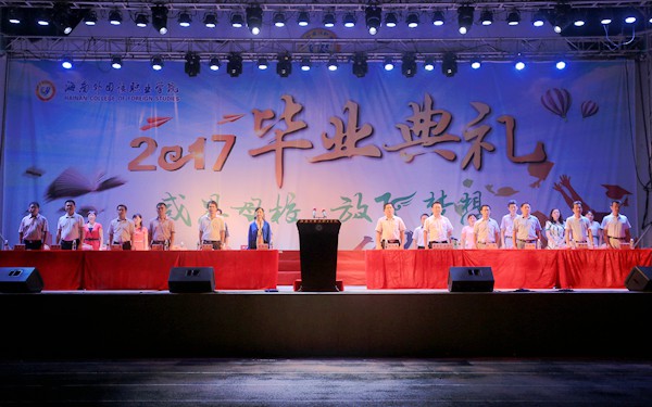 周运诗副院长随后宣读了学院关于准予2017届学生毕业的决定,同时宣布了荣获优秀毕业生、荣获优秀顶岗实习生、获得海外职院-海南师范大学“专接本”助学班项目英语专业本科文凭以及获得海外职院-广东外语外贸大学“2+2”卓越班项目日语专业本科文凭,荣获2017届国际联合培养奖学金等学生名单。学院领导分别为获得以上殊荣的毕业生们颁发了荣誉证书,为毕业生们颁发了毕业证书。毕业生们还为母校捐赠了纪念品。