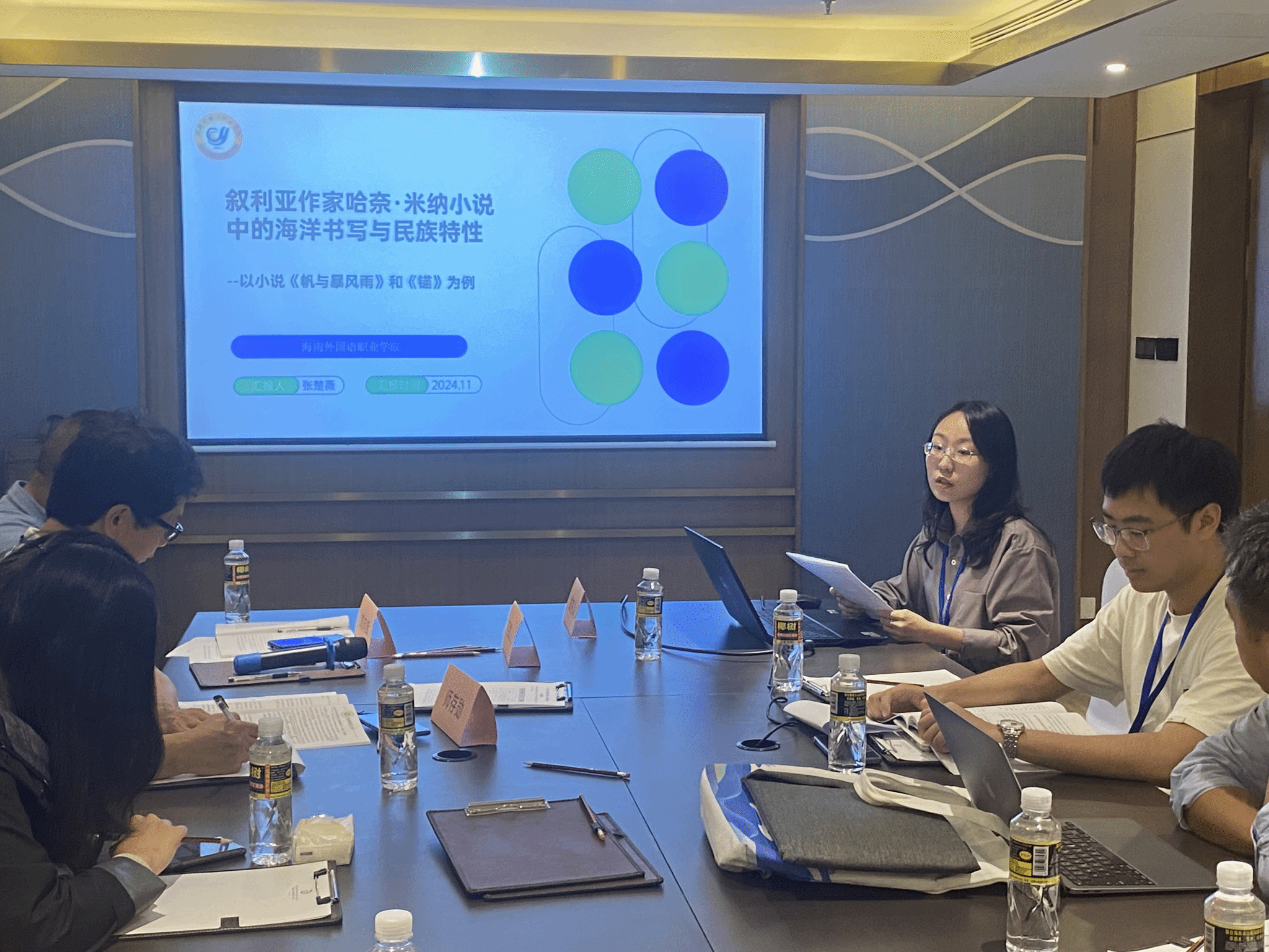 2024年11月23日晚上,在“主体性.身份认同.伦理批评”分论坛上,张楚薇博士作题为“叙利亚作家哈奈·米纳小说中的海洋书写与民族特性——以小说《帆与暴风雨》和《锚》为例”的主旨发言,主要运用詹姆逊的马克思主义批评和斯皮瓦克的后殖民理论,探讨海洋作为叙事空间如何承载民族历史文化记忆。