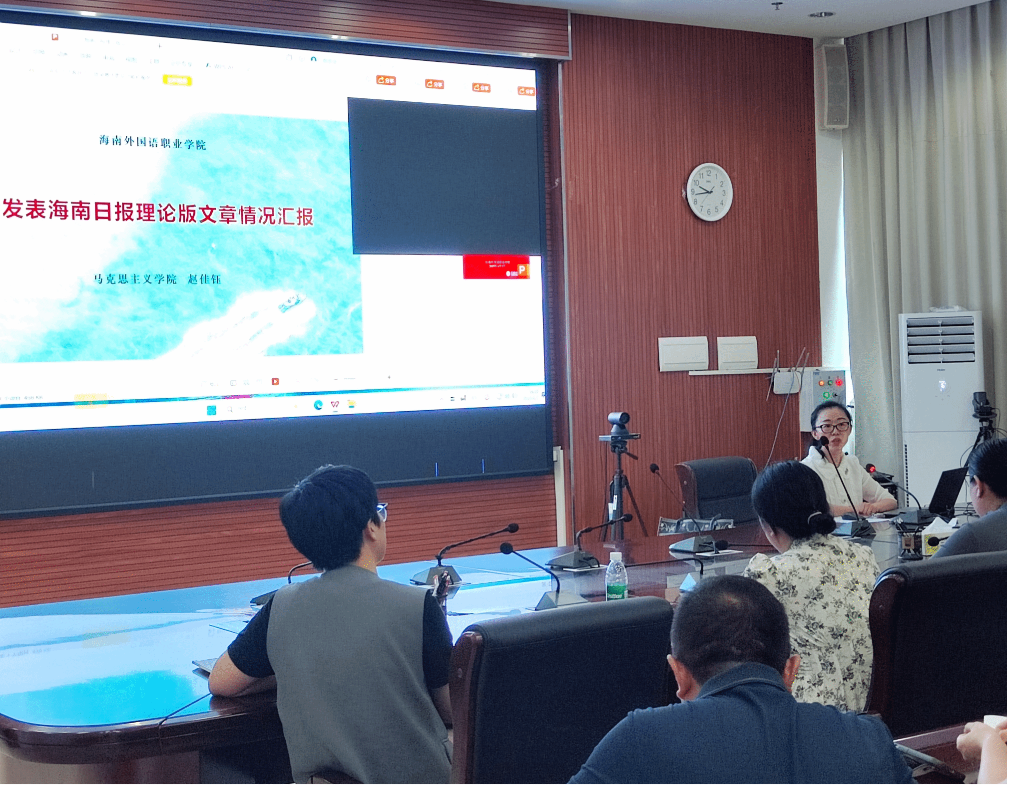 活动特邀马克思主义学院教师赵佳钰作为分享嘉宾,围绕在《海南日报》理论版发表文章的实践经验展开深度分享。赵老师结合自身在《海南日报》理论版发表文章的实践经验,以海南自贸港建设的国家战略定位和区域开放型经济需求为出发点,深入探讨了外语类高校的高质量发展路径。分享过程中,她着重强调文章创作需紧密贴合国家发展大局,将自贸港发展需求与自身专业特色有机结合,突出创新亮点。从选题方向的精准把握,到立意构思的巧妙设计,再到行文要点及注意事项,赵老师均进行了细致入微的阐释,为在场教师提供了极具实操性的报纸理论文章撰写指南。