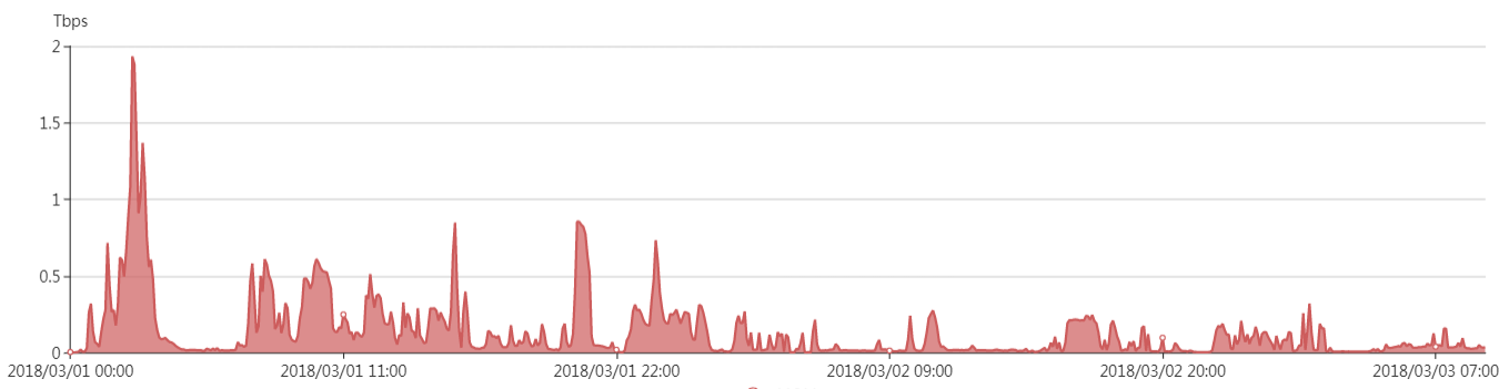 3月1日凌晨2点30分左右memcached反射攻击峰值流量高达到1.94Tbps,其中2时至3时、7时、9时、15时、20时、23时的攻击流量均超过500Gbps。