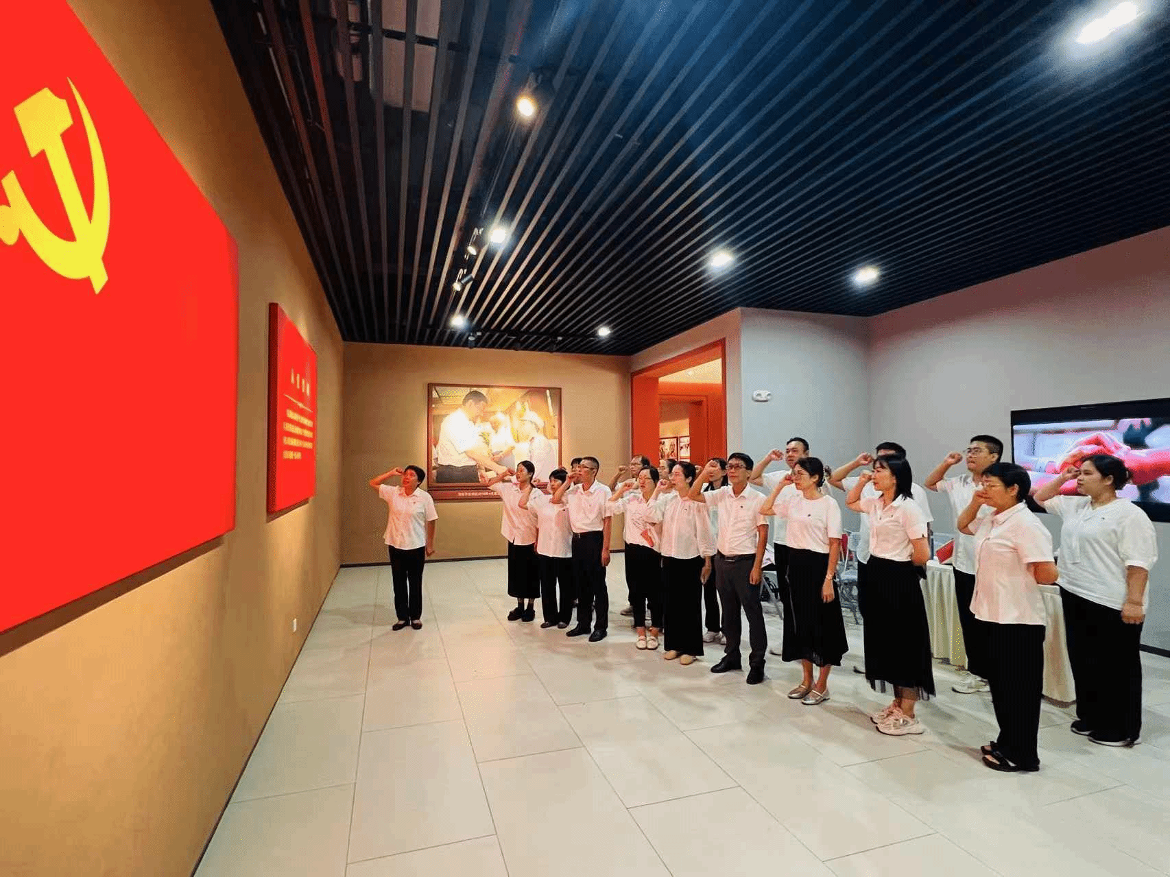 第二站来到了椰子寨战斗遗址纪念馆。1927年9月上旬,中共琼崖特委召开军事会议,决定举行全琼武装总暴动,其部署首战攻打敌人设置在嘉积镇外围的重要据点——椰子寨。9月23日晨,王文明带领定安、琼山讨逆革命军顶风冒雨强渡万泉河,从椰子寨的东门渡口登岸,向位于椰子寨青砖老街的敌炮楼发起进攻,成功占领椰子寨。椰子寨战斗在琼崖打响了武装反击国民党反动派的第一枪,树立起琼崖革命武装斗争的红旗,宣告了中共领导的琼崖革命军队的诞生,成为琼崖二十三年红旗不倒历史的开端。在讲解员的指引下,全体党员参观了椰子寨战斗遗址纪念馆,接受精神上的洗礼和爱国主义的熏陶。一幅幅弥足珍贵的资料图片、一件件充满故事的革命文物、一尊尊逼真的人物雕像,带领党员们沿着历史足迹,翻开红色记忆,回到了那个风雨如磐的年代,感受革命先辈们在党的坚强领导下坚守崇高理想信念和勇于献身的革命精神,感受琼崖战士抛头颅洒热血、不惧强敌、视死如归的奉献精神。