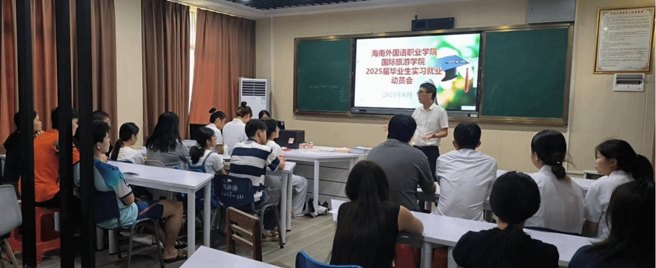 实习对于学生来说具有多重重要意义,它不仅是理论与实践相结合的桥梁,更是个人职业发展的重要基石。通过实习,学生可以掌握专业相关的技能,熟悉职场环境,了解企业文化和工作流程,提高未来的就业竞争力。为了推进2025届毕业生7月岗位实习工作,国际旅游学院分别于6月12日和6月20日在1103教室和图书馆VR实训室召开了2025届毕业生实习动员会及安全教育大会。会议出席人员包括我院党政负责人、实习指导老师、2025届7月实习高职毕业生。
