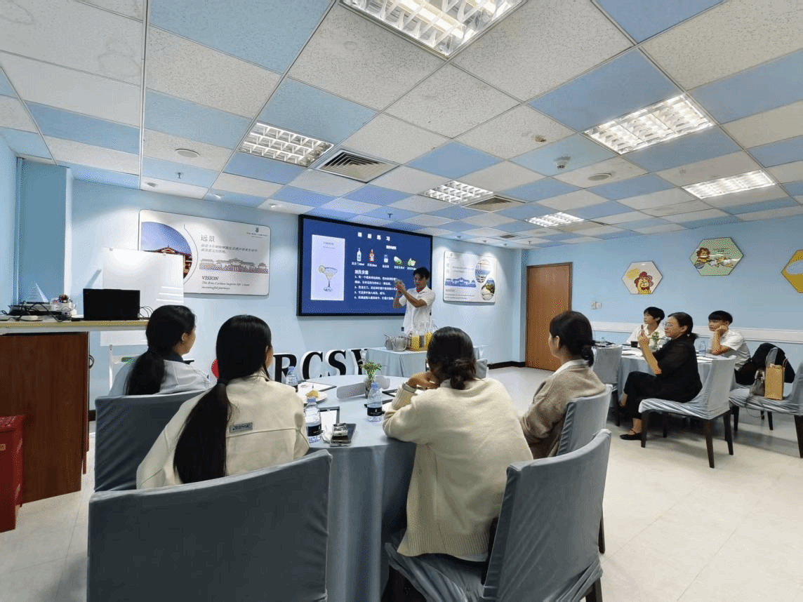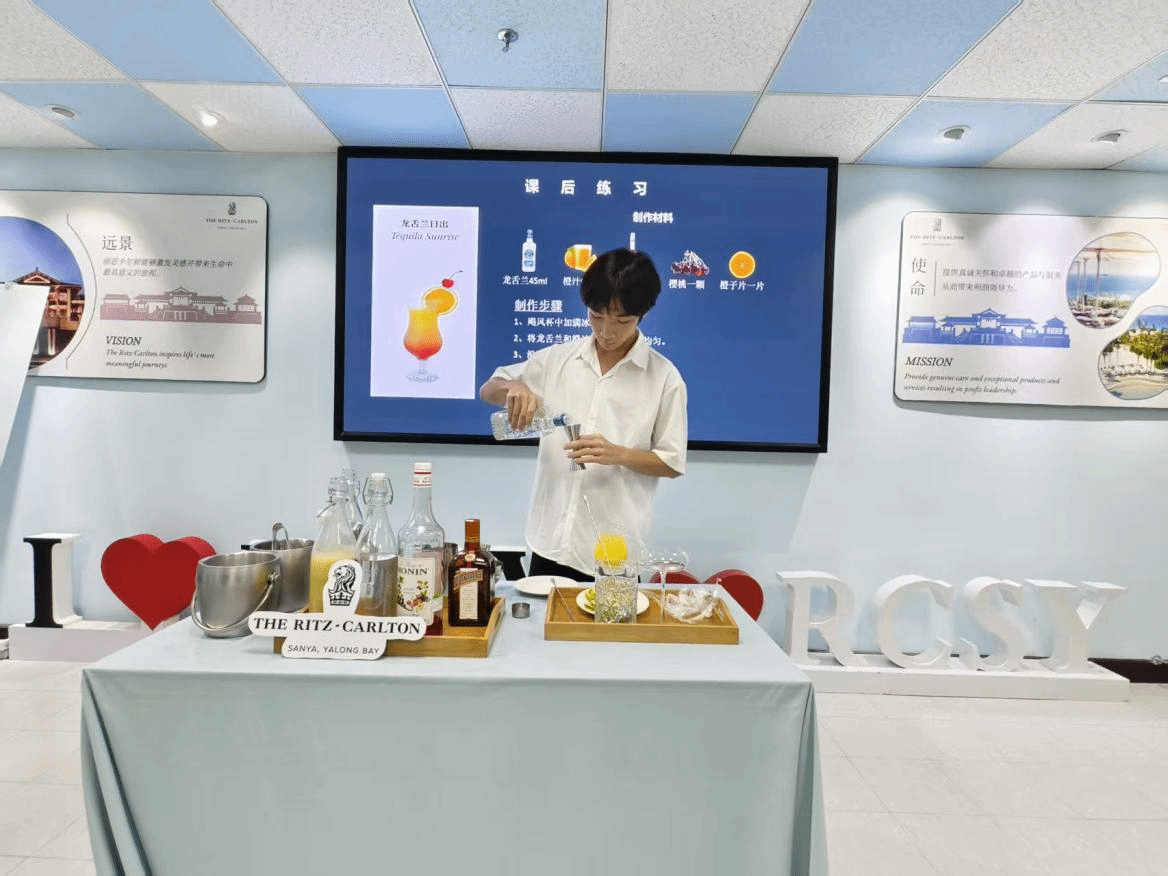在特别设置的调酒体验课程中,调酒师以优雅的手势调出一杯杯缤纷的艺术品。每一次摇动、每一次注入,仿佛都在诉说着丽思卡尔顿的创意与匠心。学生们在感官盛宴中,感受到酒店行业的精致与无限可能。