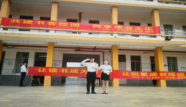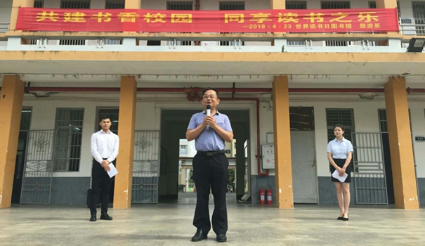 为深入学习贯彻落实国家关于倡导和开展全民阅读活动的部署,帮助大学生提高哲学及人文素养,倡导的校园阅读风尚,激发青年学生的读书热情,培养学生良好的阅读习惯。在第二十三个“世界读书日”来临之际,4月23日上午9点30我院旅游系联合图书馆在一号教学楼前举办了“让读书成为习惯,让积累成就辉煌”的主题活动启动仪式。图书馆馆长郑庭铁、旅游系系主任李旭芳、旅游系党总支林明霞及旅游系全体师生参与了此次活动的启动仪式。