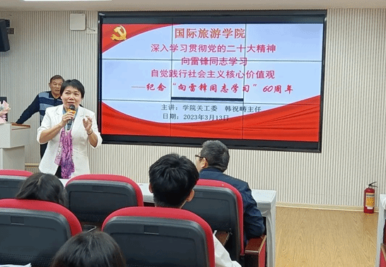 为深入学习贯彻党的二十大精神,自觉践行社会主义核心价值观,纪念“向雷锋同志学习”60周年,国际旅游学院于3月14日,在多媒体9教室开展纪念“向雷锋同志学习”专题讲座。