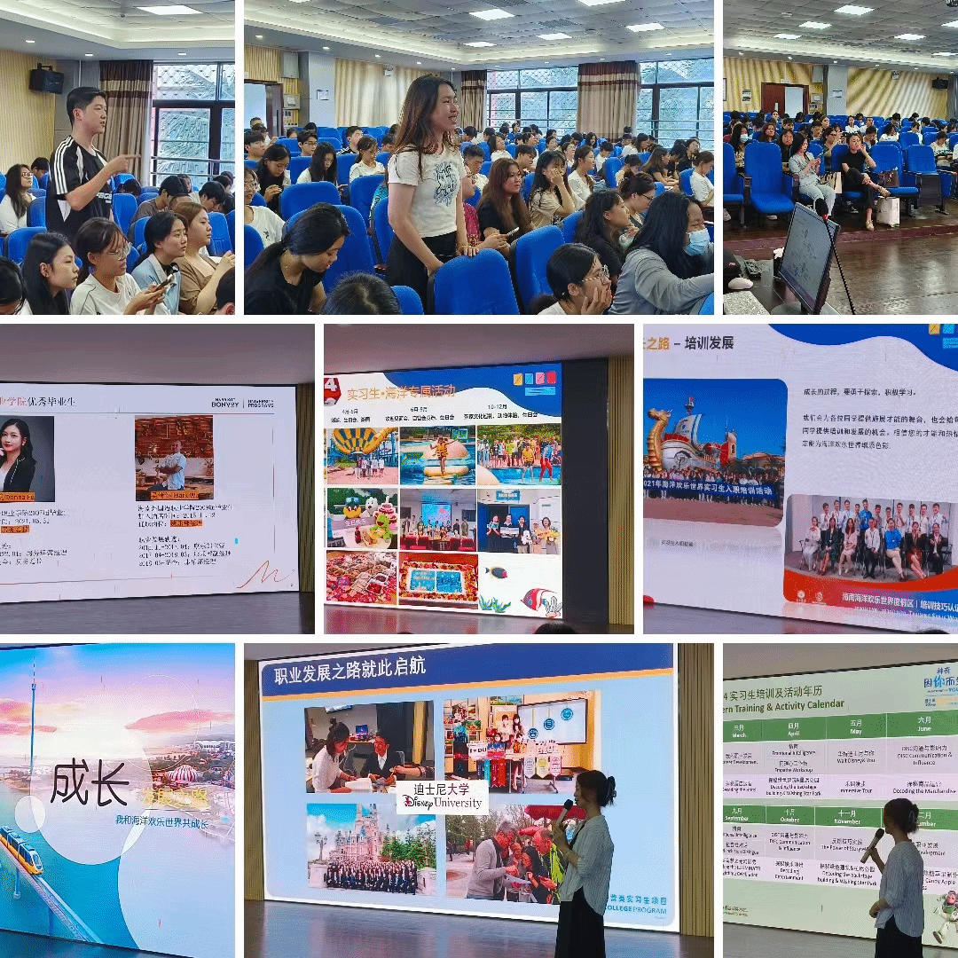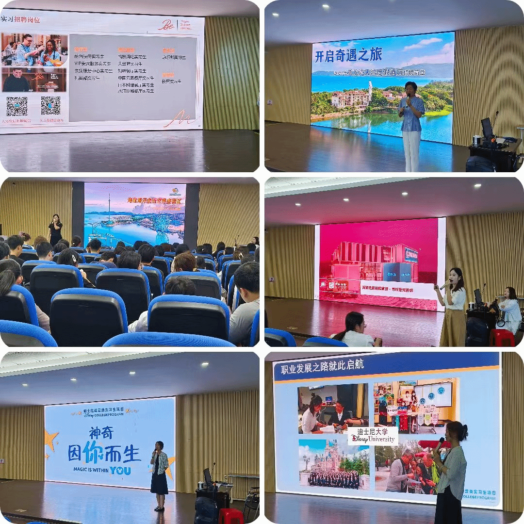 5月9日上午,在图书馆4楼VR实训室,来自三亚海棠湾民生威斯汀度假酒店、三亚天鸿酒店、海南富力海洋欢乐世界、海旅免税(三亚)迎宾有限公司、上海迪士尼乐园等5家合作企业的人事经理做宣讲会。