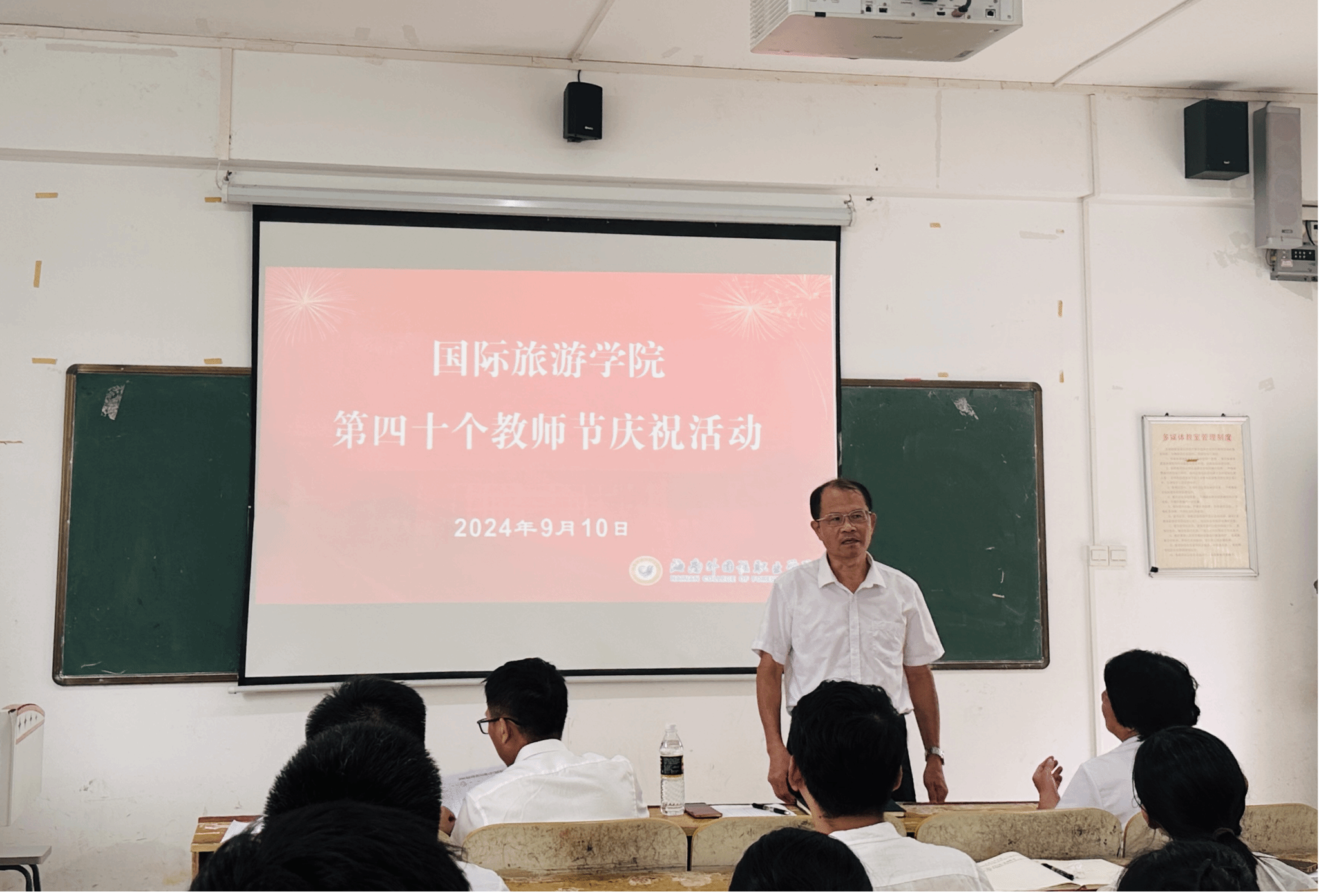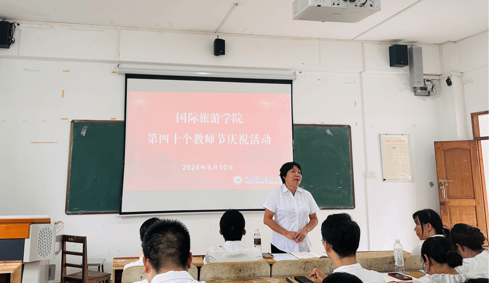 2024年9月10日上午,国际旅游学院召开会议,庆祝第四十个教师节的到来,全体教师、学生代表出席会议,党总支书记林明霞主持会议。