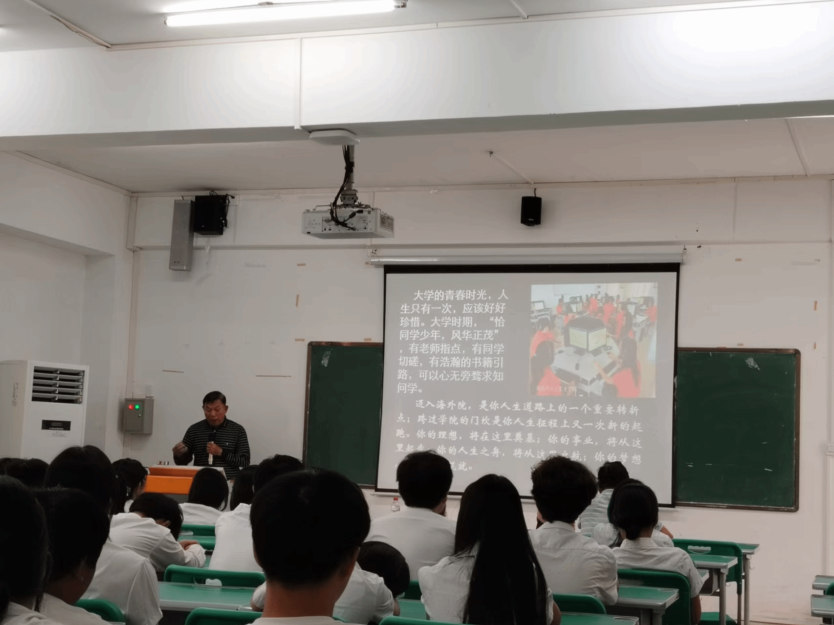 韩祝畴主任以深刻而富有感染力的语言,将学生们带入了一个充满思考与启迪的氛围中。他首先强调了“警钟长鸣,居安思危”的重要性,提醒学生们在当前和平稳定的学习环境中,不应忘记未来的挑战与机遇,要时刻保持警醒,不断自我提升。