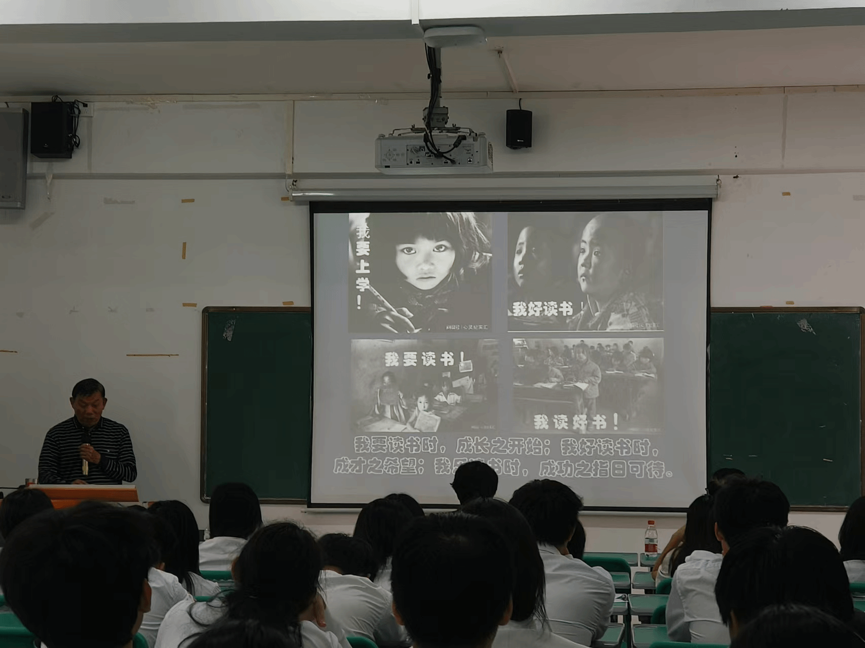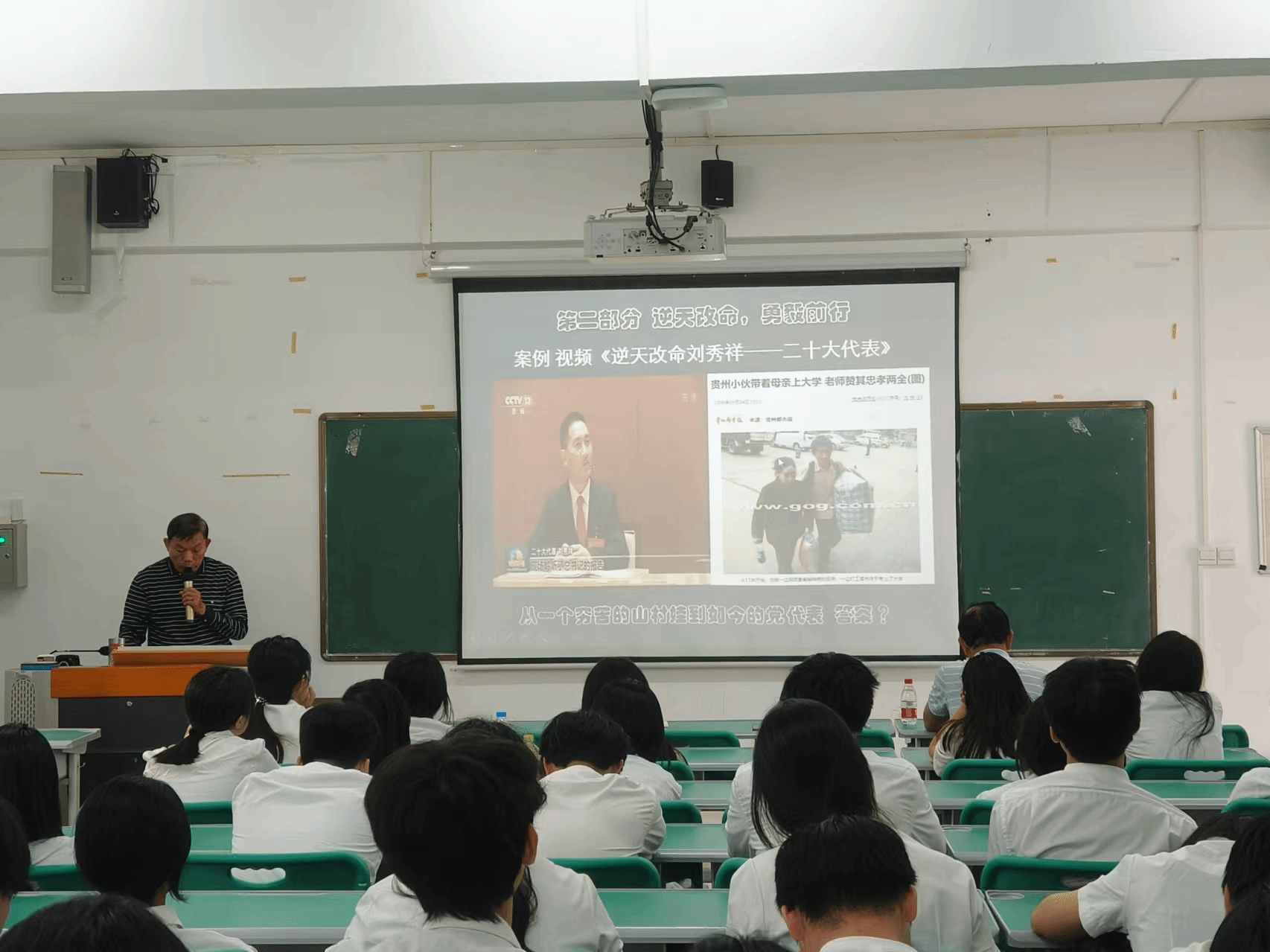 紧接着,讲座进入了“逆天改命,勇毅前行”的部分。韩主任以刘秀祥的励志故事为例,生动阐述了勤奋读书对于个人成长成才的深远意义。刘秀祥面对生活的重重困难,从未放弃对知识的追求和对梦想的执着,最终凭借自己的努力和坚持,实现了人生的华丽转身。这一故事深深触动了在场的每一位学生,激发了他们内心深处的斗志与勇气。