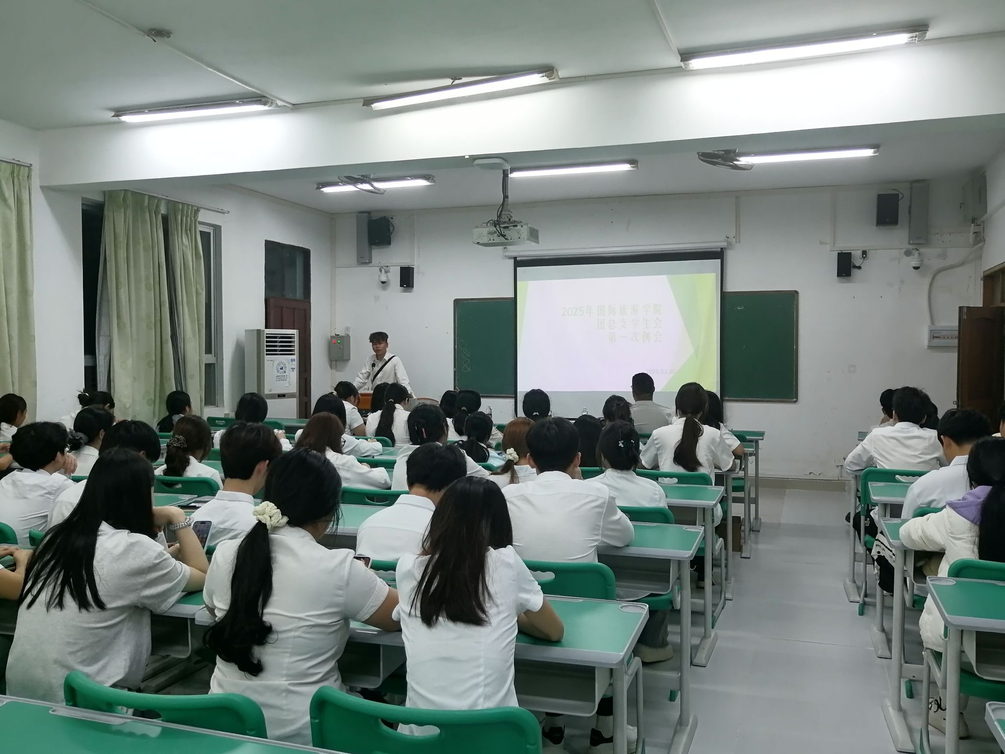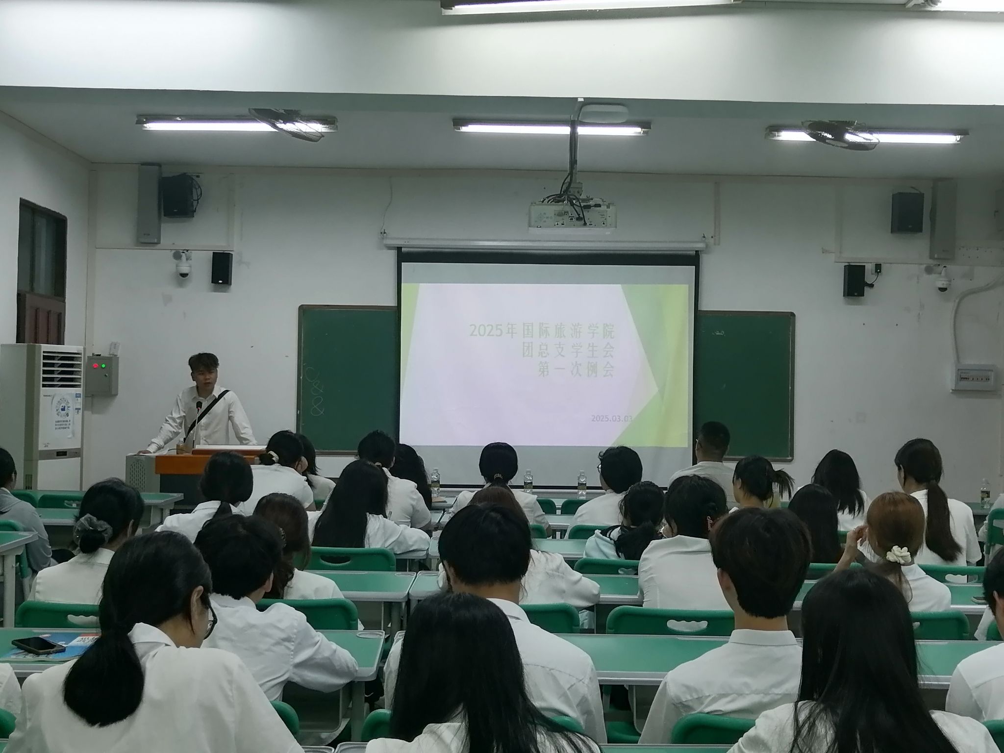 在新学期开始,为了进一步明确学生会的工作方向,加强团队凝聚力,国际旅游学院团总支学生会于2025年3月3日在多媒体13教室召开团总支学生会第一次例会。本次例会由学生会主席赵东乙主持。此次例会不仅是对过去工作的总结,更是对未来发展的展望与规划。