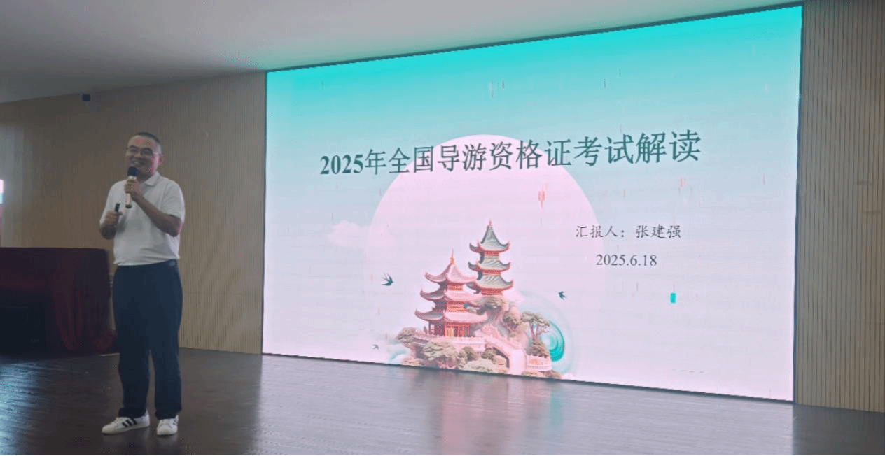 讲座中,张建强以其丰富的从业经历和扎实的专业功底,围绕“导游技能提升与职业发展规划”主题展开深入讲解。作为国家金牌导游、高级英语导游,张老师结合自身多年来为各国政要、贵宾提供导游服务的宝贵经验,从导游职业价值、行业发展前景、导游资格证考试备考策略等多个维度进行了全面讲授。在导游词创作与讲解技巧环节,他通过落笔洞等具体景点案例,以及示范讲解,生动展示了不同讲解技巧的实际运用效果,让抽象的理论知识变得具体可感。
