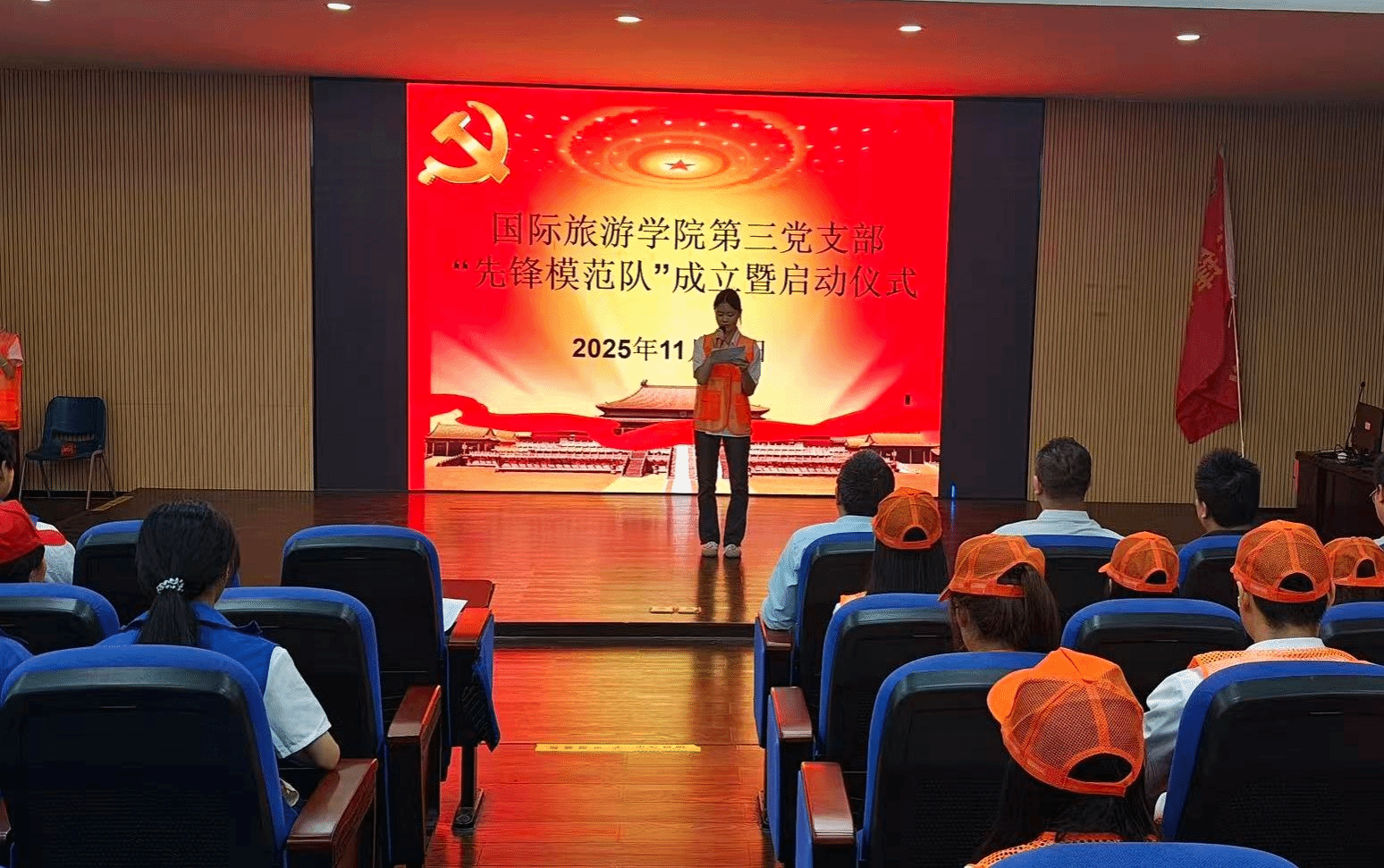 随后,周群林郑重宣布:“国际旅游学院先锋模范队,正式成立,启动!”铿锵有力的话语回荡在整个会场,标志着国际旅游学院学生自我管理与服务实践迈上了一个新的台阶,开启了以党建带团建、以党员带群众的育人新篇章。