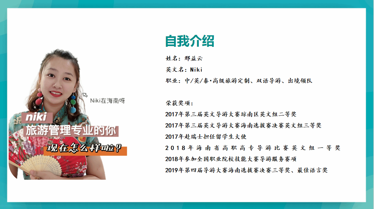 我的职业路是一步步摸索出来的,核心离不开 “敢尝试”。在校时,我在呀诺达景区实习做中文讲解员,在校虽学过基础英语,但从没想过能用于专业场景。后来有幸代表景区参加海南省导游大赛,这是我第一次用英语挑战专业赛事,简单准备后便全力冲刺,最终获得了市级二等奖、省级三等奖的成绩。这次尝试让我意外发现,英语能变成核心专业技能,之后便主动用英语接待外国游客,慢慢成长为双语讲解员,积累了宝贵的涉外服务经验。