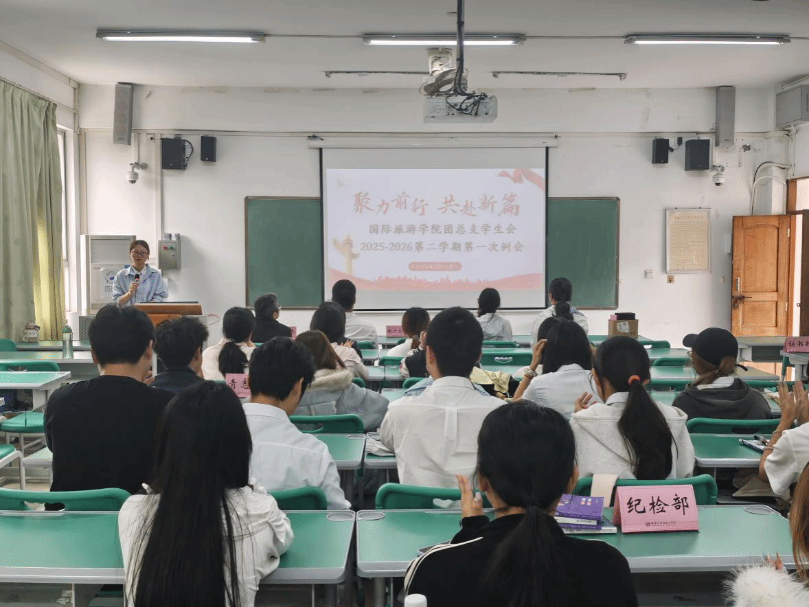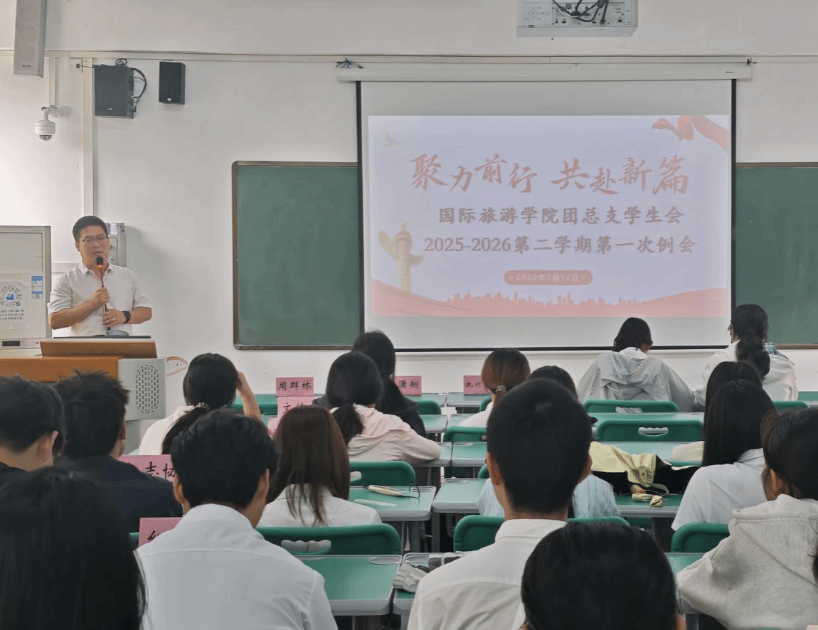 春回大地,万象更新。为明确新学期工作方向,凝聚团学骨干力量,国际旅游学院团总支学生会于2026年3月12日在多媒体15教室顺利召开2025-2026学年第二学期第一次例会。会议由团总支学生会执行主席云春雨主持,学院党总支副书记周群林、团总支书记高潇翔、学生会主席团成员、各部门部长及干事齐聚一堂,共绘新学期工作蓝图。