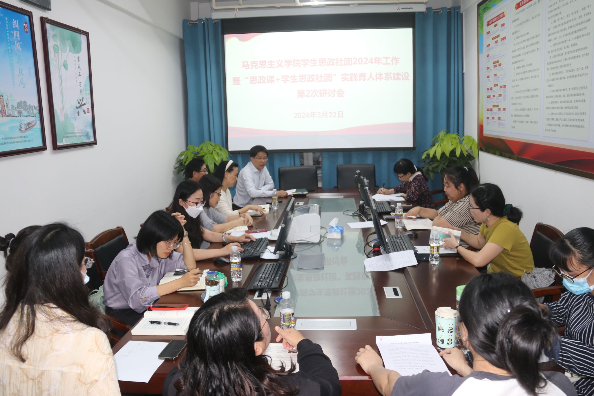 2024年3月22日下午,马克思主义学院召开学生思政社团2024年工作会议暨“思政课+学生思政社团”实践育人体系建设第2次研讨会,旨在集聚全院教师之智慧,助力打造学生社团精品品牌,进一步健全“思政课+学生思政社团”实践育人体系,进一步提升思政课实践教学质量。会议由马院党总支书记邢益承主持,马院院长周清云及马院全体教师参加。