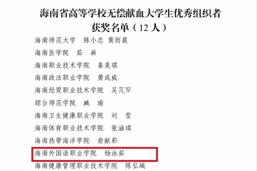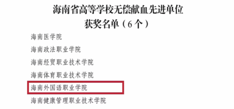 近日,海南省卫生健康委员会、海南省教育厅、海南省红十字会联合下发的《关于表彰 2023 年度海南省高等学校无偿献血先进单位和优秀个人的通知》,对于2023年度无偿献血工作中做出贡献的高校和个人予以表彰。开云官网荣获“2023年度海南省高等学校无偿献血先进单位”称号,张桓桓老师荣获“海南省高等学校无偿献血先进工作者”称号,杨泳茹同学荣获“海南省高等学校无偿献血大学生优秀组织者”称号,张艺文等6位同学荣获“海南省高等学校无偿献血优秀个人”称号。