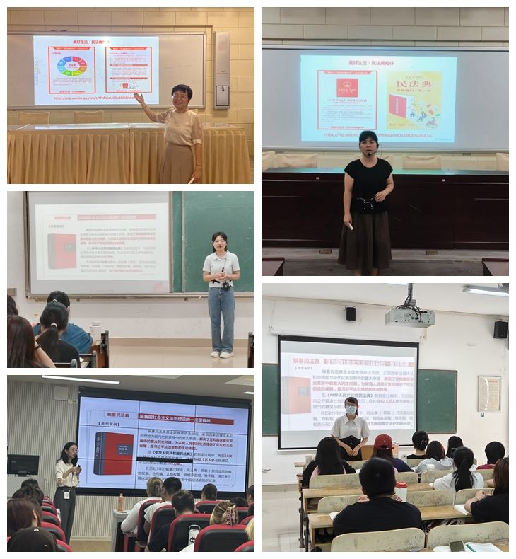 为促进教师积极学习领会《民法典》精神并有效开展教学,《思想道德与法治》《习近平新时代中国特色社会主义思想概论》《形势与政策》等课程教研室认真开展集体备课。思政课教师通过思政课堂,结合真实案例,围绕大学生学习和生活密切相关的内容,对民法典进行了详细阐释,认真组织开展了“美好生活·民法典相伴”为主题的课前新闻播报,充分发挥课堂主渠道作用,引导学生们培育法治精神,恪守法律底线,养成尊法学法守法用法的良好习惯。