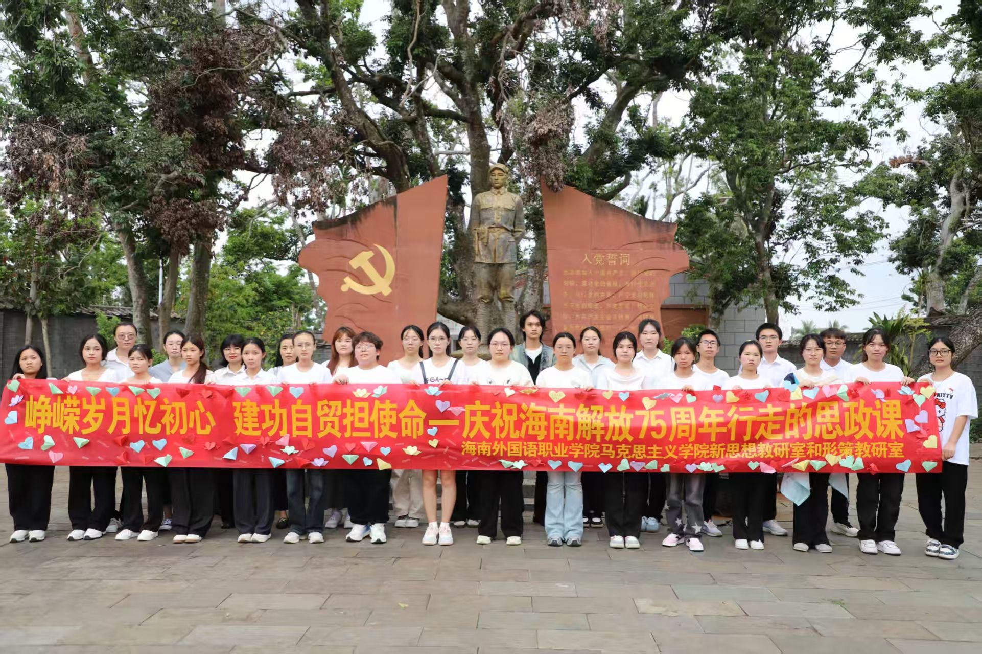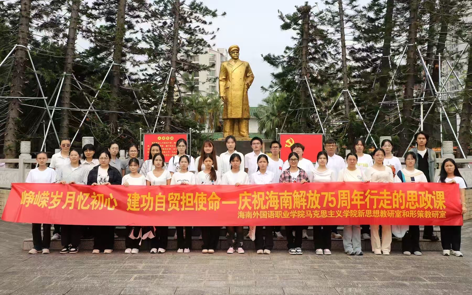 2025年4月25日,在纪念海南解放75周年之际,马克思主义学院习近平新时代中国特色社会主义思想概论教研室创新思政课上课形式,以“峥嵘岁月忆初心,建功自贸担使命”为主题,到文昌张云逸将军纪念馆、冯平故居开展沉浸式“行走的思政课”。通过“课堂+实践”、“讲解+体验”式的立体化教学,师生们以脚步丈量红色热土,用行动传承革命精神,为海南自贸港建设注入青春力量。