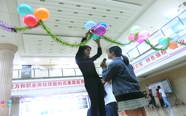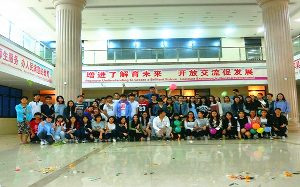 交流会在综合办公楼一楼大厅举行。为了更好地营造会场的气氛,会员们积极布置活动现场,五颜六色的气球和彩带温馨了整个会场。19:00交流会正式开始,同学们围成一个大圈坐在大厅的地板上。首先由主持人致开幕词,再由周群林老师上台发言,老会长黄艳霞介绍会场的纪律以及新会长马文静解释希望通过本次交流会,会员间建立友好关系。