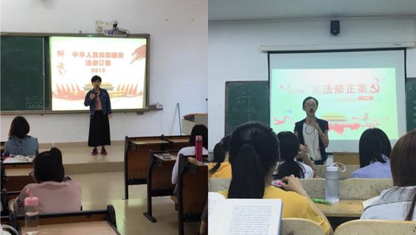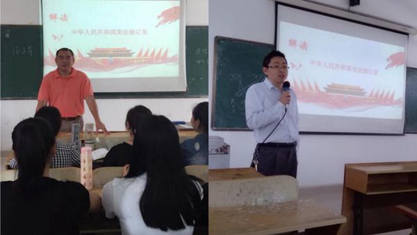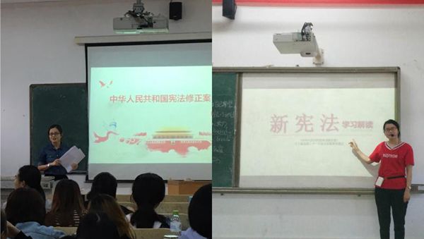 我部教授《毛泽东思想和中国特色社会主义理论体系概论》课的9名教师经过集体备课,反复进行教案修改,精心制作课件。在专题讲授中,教师们通过本次修宪的重大意义、基本原则、主要内容三个方面进行深入细致的解读,内容丰富,资料详实,以案说法,旁征博引,收到了较好的教学效果。本次专题讲授面向我院大一和大二全体学生,起到了广泛宣传宪法精神,提高社会主义法治意识的作用。