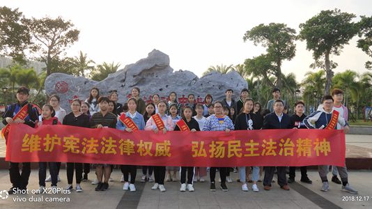 2018年12月17日下午四点半,时事协会指导老师周群林组织该协会成员在学校东门侧的市民健身活动中心开展了普法宣传活动。此次活动以“维护宪法法律权威,弘扬民主法治精神”为主题,目的在于纪念国家第五个宪法日,同时增强市民维护宪法和法律权威意识,增强守法意识,提高法律素养。