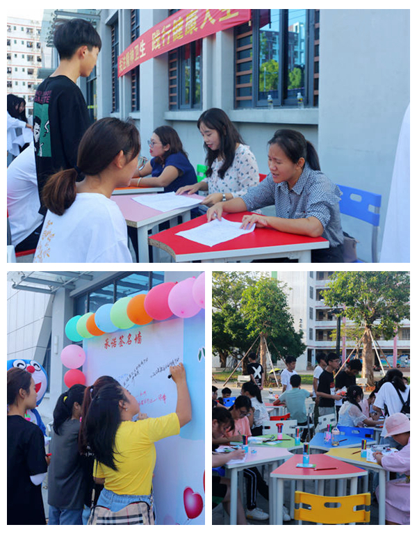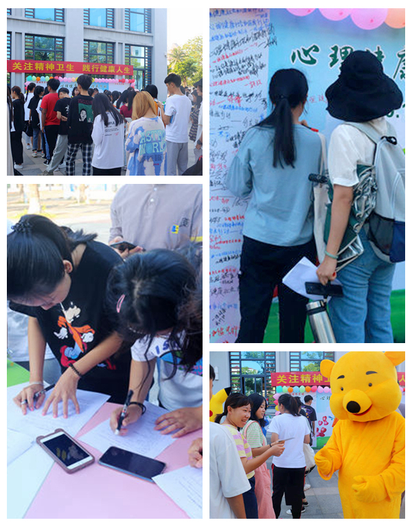 10月24日下午,我院在体艺馆前开展“心理健康社会和谐我行动”户外宣传教育活动。心理咨询中心老师和各系部学生共同参加活动。 此次活动包括承诺签名、心理测试和咨询、制作心理健康主题画、心理知识小问答等。活动现场,同学们有的在承诺签名墙签字,领取心理健康知识手册;有的在心理老师的引导下进行心理测试,并聆听心理老师做出的咨询诊断;有的画一幅心理健康的主题画,运用绘画疗法使学生在创作的过程中体验心理健康的意义,提高学生关注自我心理健康的意识;还有的参与心理知识小问答,在一问一答中更好地学习和了解心理健康知识。 值得一提的是,心理老师还在活动现场提供个别咨询服务,同学们在心理咨询后可根据需要与老师进行深入会谈,接受老师提供的持续跟踪咨询服务。 此次活动以学生为主要参与对象,通过有趣的活动环节让同学们在轻松愉快的氛围中学习心理健康知识,提高心理素质,有利于引导同学们积极关注心理健康、表达心理感受,提升同学们的心理健康水平,培育同学们自尊自信、理性平和、积极向上的健康心态。
