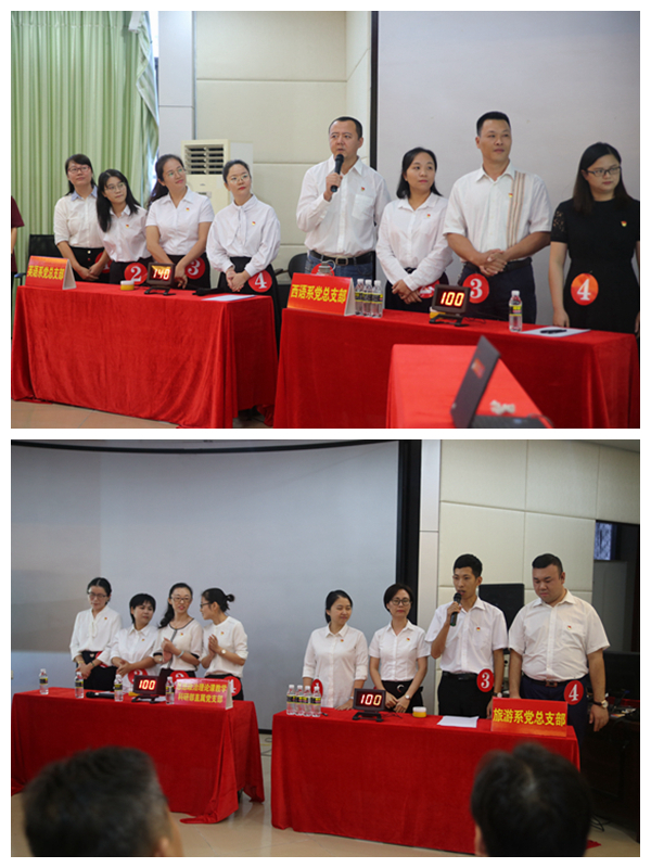 决赛设置了必答题、抢答题和观众互动等环节,题型为选择题、判断题和简答题。比赛中,选手们精神饱满、全神贯注、沉着应赛。必答题稳扎稳打,抢答题毫秒必争,观众互动积极踊跃。现场气氛紧张热烈,不时响起阵阵掌声和加油呐喊声。经过激烈角逐,最终西语系党总支部获得竞赛一等奖,旅游系党总支部获得二等奖,英语系党总支部和思想政治理论课教学科研部直属党支部获得三等奖。