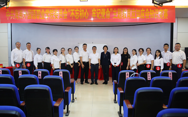我院自9月份开展“不忘初心、牢记使命”主题教育以来,大力抓好主题教育学习研讨,把学习教育贯穿于主题教育全过程。为进一步推进“不忘初心、牢记使命”主题教育走向深入,检验学习成效,增强主题教育效果,我院于11月开展了主题教育应知应会知识竞赛活动,并于11月19日下午在图书馆4楼3D仿真模拟实训室举办了知识竞赛决赛。 学院党委书记曾锋,党委副书记、纪委书记徐畅,党委委员梁松亲临现场,与各基层党组织党员一同观看了决赛,并分别为获奖队伍颁奖。经过前一阶段的初赛,英语系党总支部、西语系党总支部、旅游系党总支部、思想政治理论课教学科研部直属党支部等四支参赛队伍脱颖而出,进入决赛。