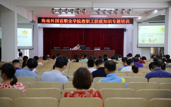 为不断加强教职工防疫知识技能普及宣传,全力保障2020年春季学期开学工作平稳有序进行,4月30日下午,我院在图书馆多功能报告厅开展教职工防疫知识专题培训,邀请文昌市疾控中心副主任技师、防控专家邝正文来校讲授疫情防控知识。在家的学院院长李渝凤、副院长杨学前、党委委员梁松,与各部门、各系部主要负责人,有关职能部门工作人员,全体学工人员等一同参加培训。杨学前副院长主持培训会。