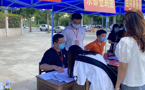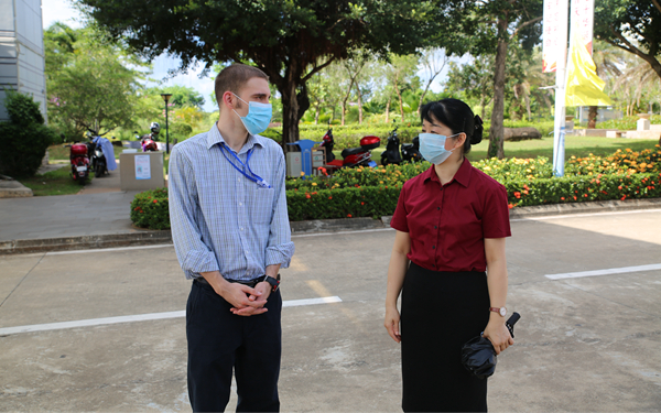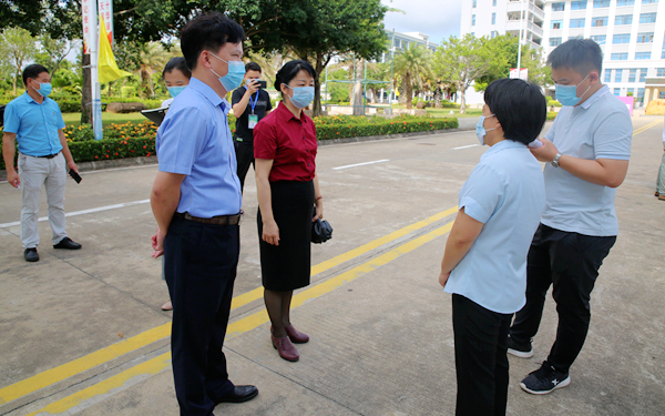 在学院东门,李渝凤院长、杨学前副院长与正在我院进行开学督导的文城镇防控指挥部工作人员热情交谈,对文昌市及文城镇当地政府部门在学院防疫及开学工作期间给予的鼎力支持表达了感谢。