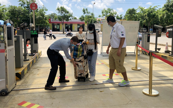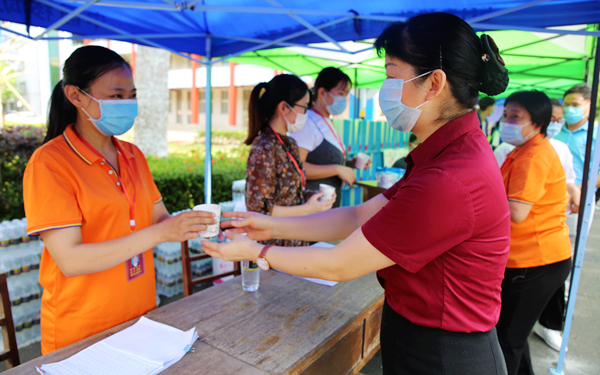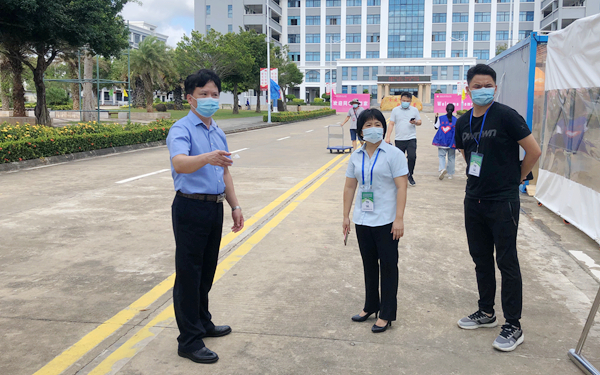 在学院北门,李渝凤院长亲切问候了正在北门迎接学生返校的值班中层干部、各系部老师和学生志愿者们,并与文昌市教育局派驻我院的教育专员、市疾控中心派驻我院的疾控和医务工作人员亲切交流,感谢他们对学院学生返校复学工作的大力支持。