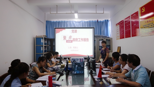 为深入学习领会全国“两会”精神,2020年6月29上午8:30分,思政部直属党支部书记周清云同志给全体党员讲授题为《聚焦2020年政府工作报告》的专题党课。