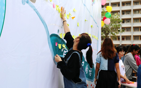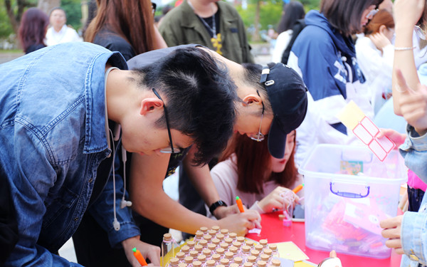 25日下午,活动现场的同学们将对自己的期许写在便签上贴在活动板中,寄存爱的漂流瓶写下对校内同学、老师、朋友想说的话并由心理社团的同学们转交、进行一个爱的传递,由可爱人偶分发心理宣传手册,让同学们学习基本的心理知识。